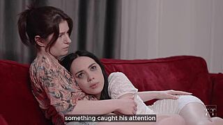 clothed brunette keeps an eye on the action in high-def fetish scene