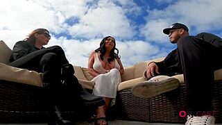 Two horny stepdaughters tease their stepdad by the pool, leading to a wild threesome