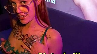 Nerdy tattooed brunette sucks cock shakes ass and squirts hard on muscular stud