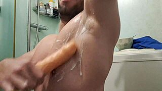 Masturbating with oiled cock, hot semen dripping after intense bedroom session