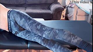 muscular bodybuilder stretches skinny neighbor on massage desk in tight leggings and socks