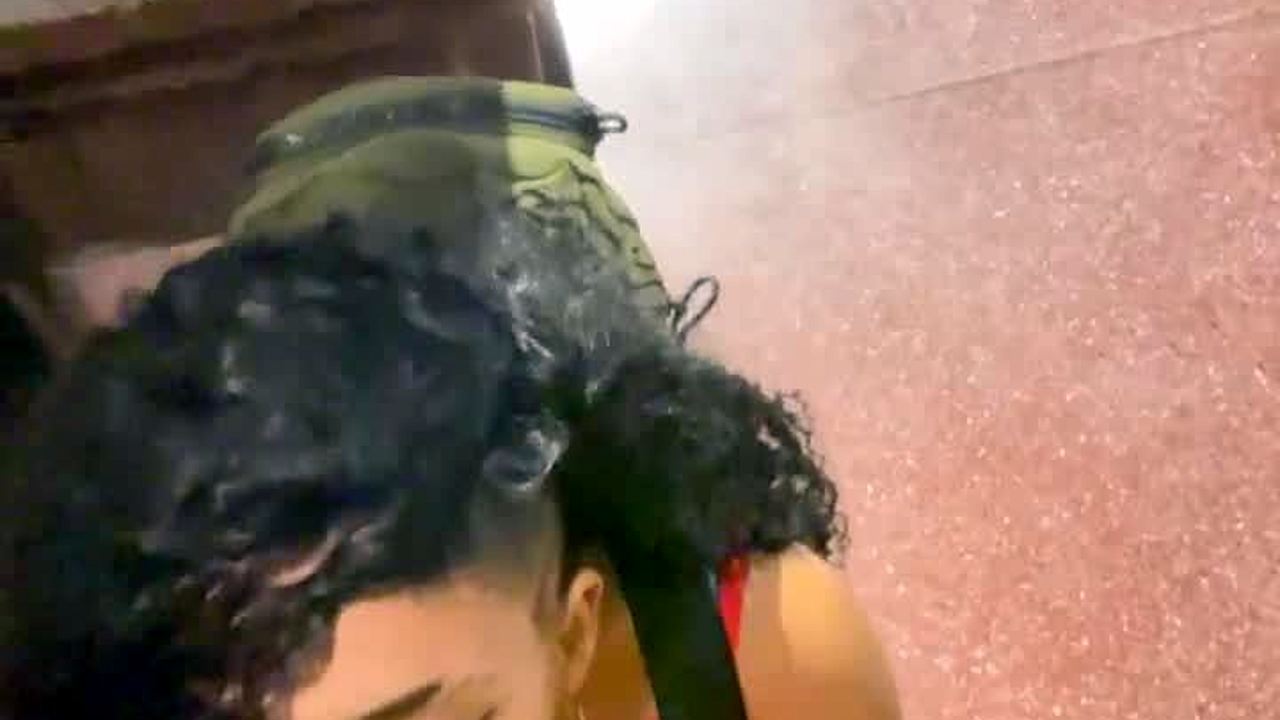 Enteada de cabelos pretos leva gozo nos peitos