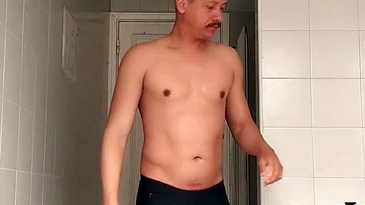 Guy in black beach shorts shaves smooth in intriguing bathroom reveal