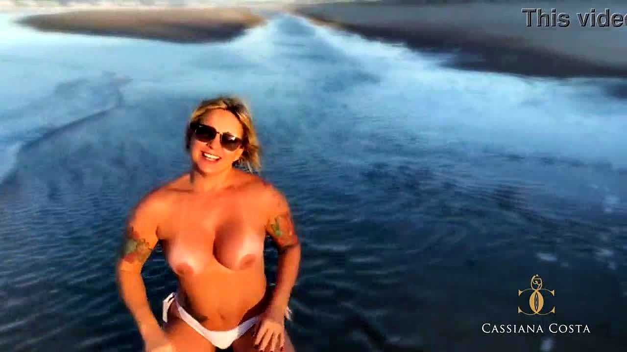 busty cougar flashed huge tits to a stranger on the beach.